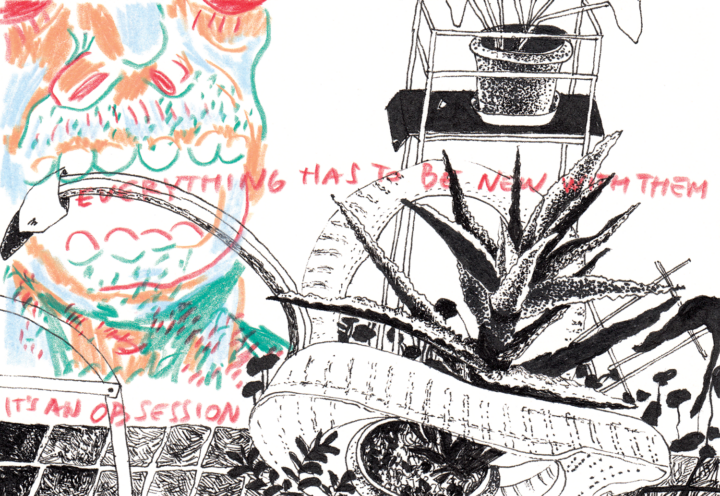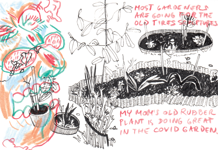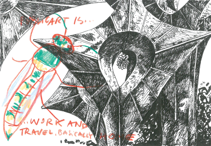 4 desene originale prezentate sub formă de cărți poștale, combinând ilustrații clasice ale grădinilor amenajate pe terenuri publice în Drumul Taberei, trei realizate de oameni și una de o viespe, cu comentarii imaginare colorate. Acestea au fost trimise lui Alex Axinte, cu o mică explicație pe verso.