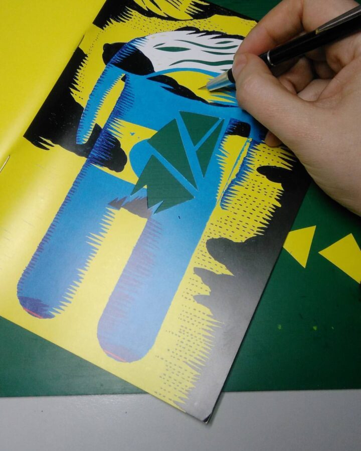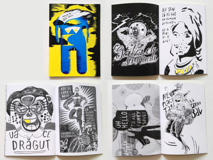 fanzin, 40 de pagini, print alb-negru, desen galben, copertă decupată, semnat