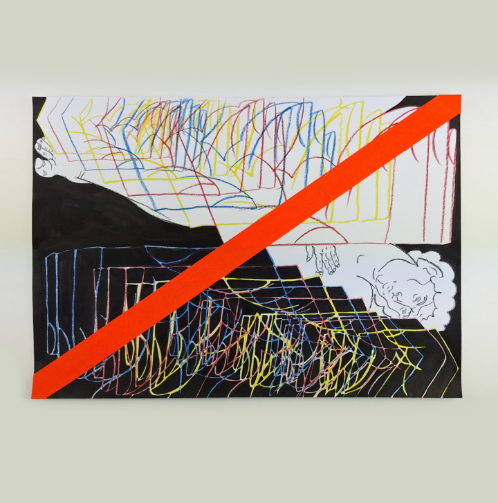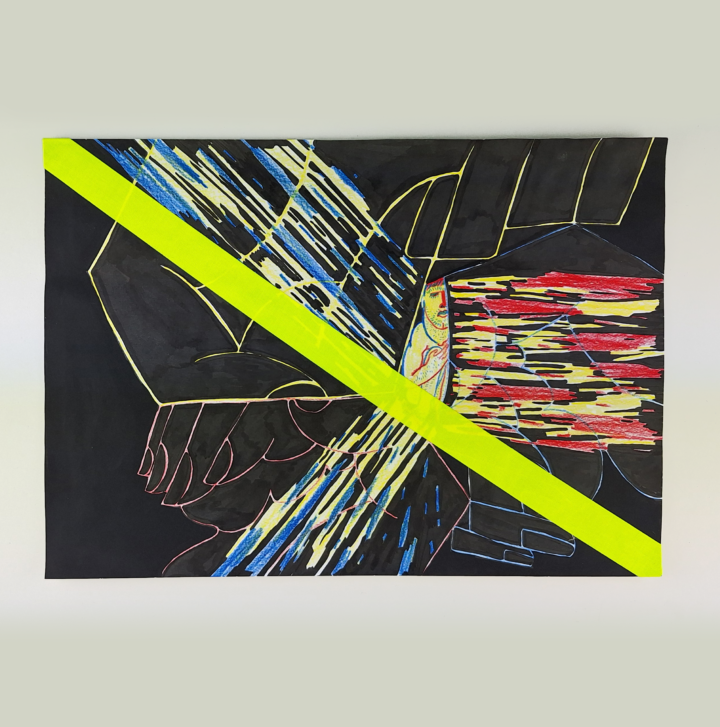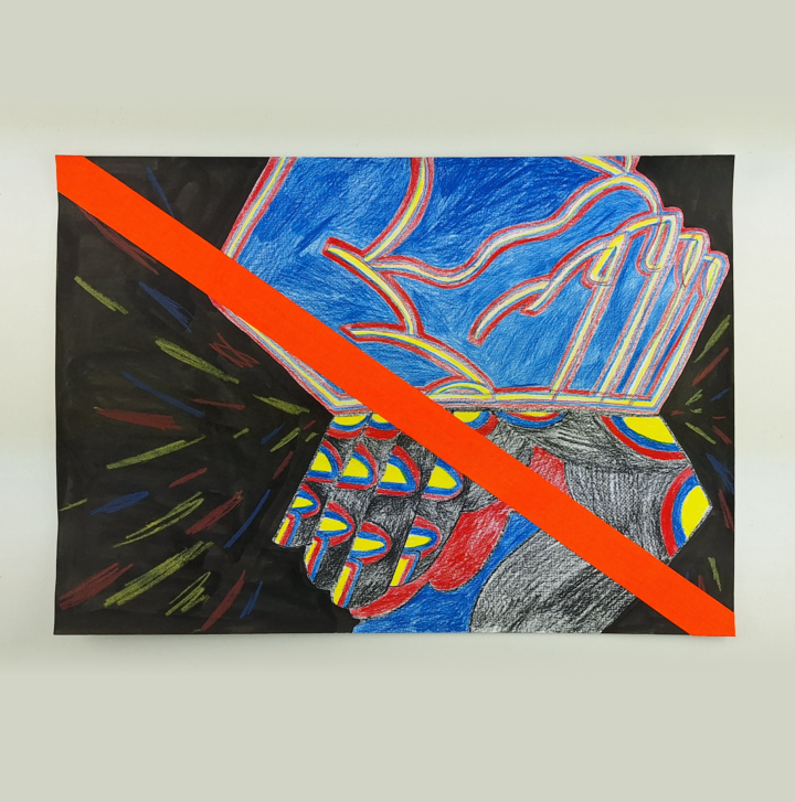 Traumator, the superhero fueled by their past trauma, always chased by the Nemesis, their own true self. This is one of a 9 drawing series which make up LuciAna’s Nine Gates of Other People show in Belgrade, and were also present in LuciAna’s Offerings show in Timisoara.