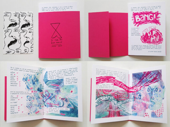 Fanzină A5, 16 pagini + copertă, cusută, hârtie reciclată 300 g.